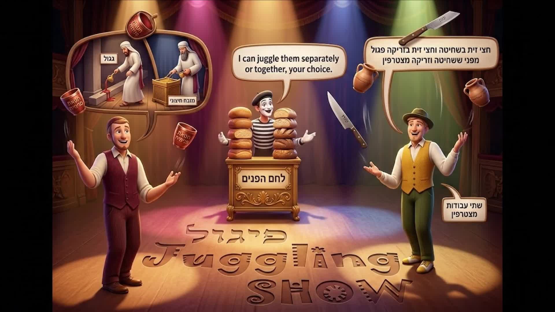 On the previous Daf, Rebbe Yose ruled that פיגול intent about one loaf of שתי הלחם does not render the other loaf פיגול, yet he ruled in a Baraisa that פיגול intent for a כזית from both loaves can combine to make פיגול. Having proven that Rebbe Yose agrees that פיגול about one part makes the entire korban פיגול, Rebbe Yochanan gives a new explanation of Rebbe Yose’s ruling: הכתוב עשאן גוף אחד – the Torah made them one item, והכתוב עשאן שני גופין – and the Torah made them two (separate) items. They are considered one item, דמעכבי אהדדי – because they are essential to each other, and both are required to offer either. Yet, they are considered two items, because Hashem said they should be made separately. Therefore, regarding פיגול, they can also be considered one item or two items: ערבינהו מתערבין – if he combined them (by intending to eat a כזית from both), they are combined and the פיגול is effective; פלגינהו מיפלגי – If he separated them (by intending פיגול only about one of them), they are separated, and only that loaf is פיגול.