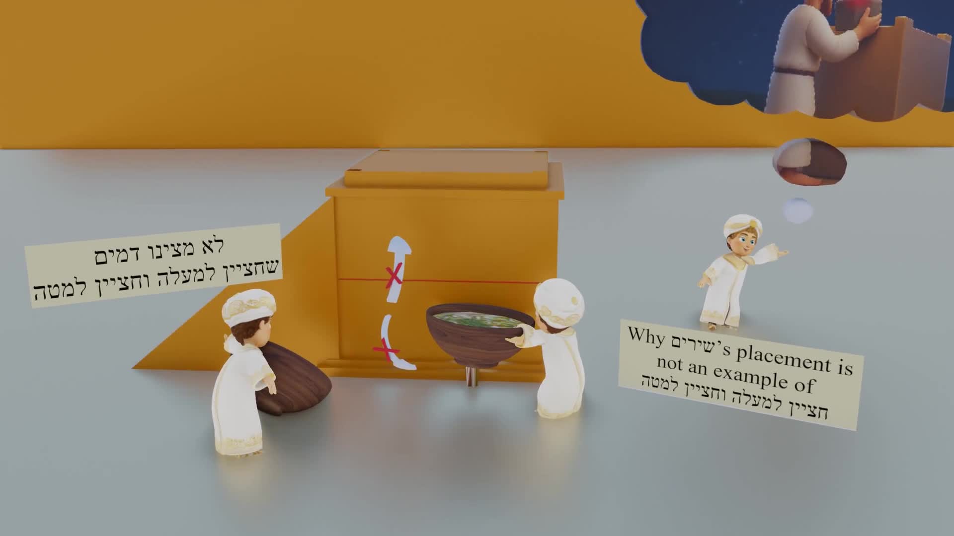 The Gemara objects to the previous assertion (that no blood מתנות are partially “above” and partially “below”) from various הזאות performed by the כהן גדול on Yom Kippur, but clarifies that they were not done in different places. The Gemara then asks that שירים – remnants of a חטאת are poured into the base of the מזבח, while its מתנות are above the line!? It answers that the pouring of שירים is not מעכב, and the principle that all מתנות must be in the same place only refers to מתנות which are מעכב. The Gemara still objects that there is an opinion that שירים הפנימים – pouring the remnants of the blood of inner חטאות is מעכב, yet it is poured in the יסוד of the מזבח, while the מתנות are all placed on the קרנות of the מזבח הפנימי (“above”)!? It answers: בחד מקום קאמרינן – we are only saying about one location (i.e., one מזבח) that all מתנות are either above or below, but this does not apply to a חטאת הפנימית, whose מתנות are placed in the מזבח הפנימי, and its שירים on the מזבח החיצון.